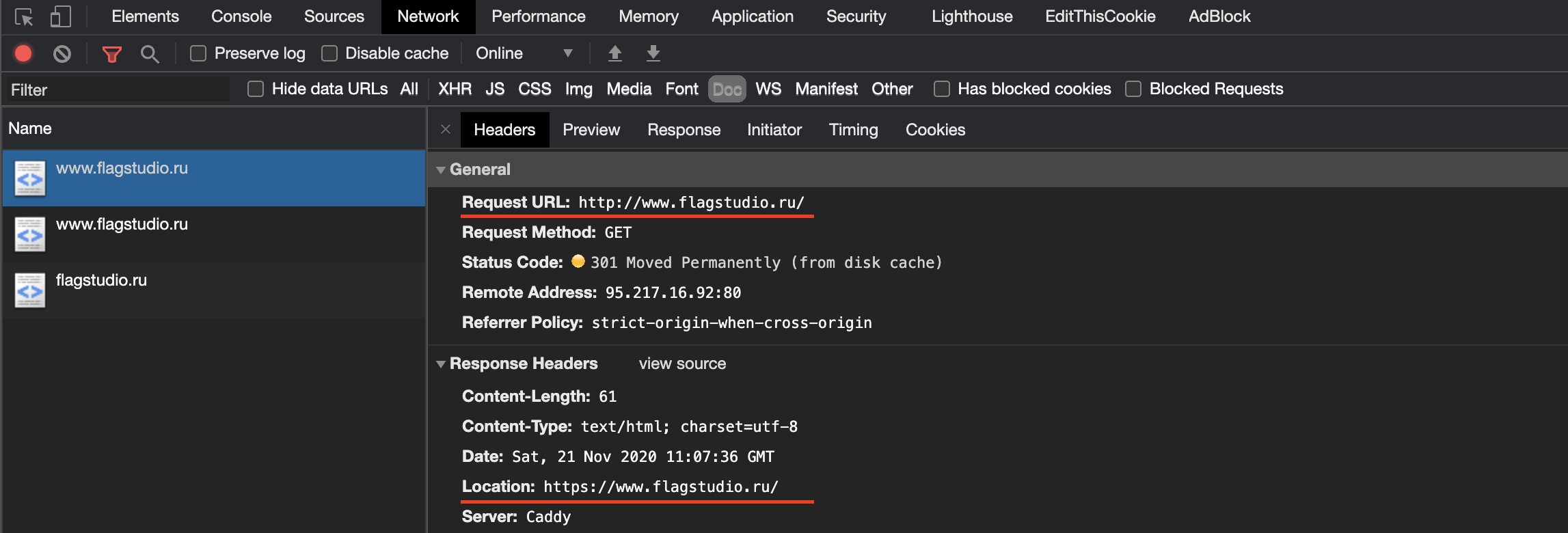Редиректы можно проверить браузером через вкладку Network