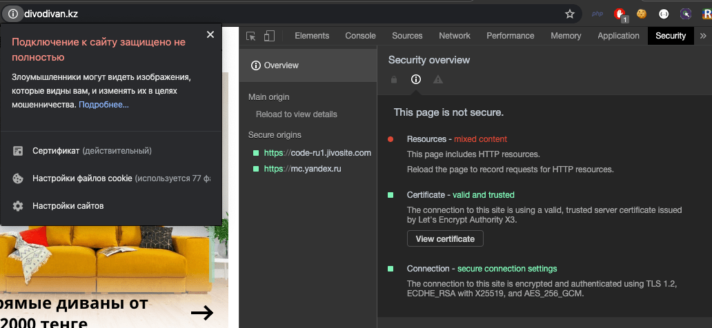 На скриншоте видно, как посмотреть подробности о сертификате и наличие ошибок в странице. Конкретно на этом скриншоте показана вторая проблема, так называемая "mixed-content error", то есть часть контента прилетает по HTTP.